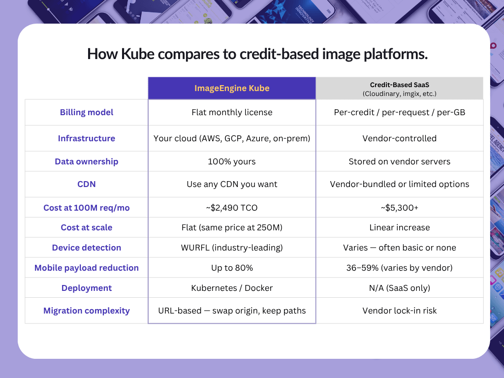 Don't take our word for it — model it yourself. Our pricing estimator lets you input your monthly image requests, average image size, and infrastructure costs, then shows you a side-by-side total cost of ownership: Kube's flat license + your AWS costs vs. what you'd pay a credit-based platform at the same volume.